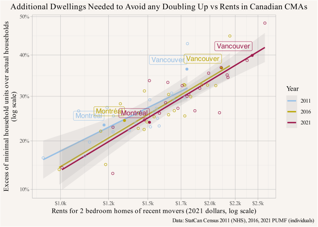 In our current system it’s not government giving out incentives to share housing, it’s the market generating high rents for a scarce resource. We can see the relationship directly by plotting prevailing rents against the number of homes needed to avoid all doubling up in Figure 3. (Lauster Nathanael and von Bergmann 2024)