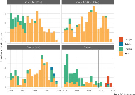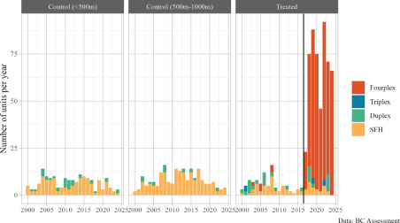 Subsequently, we felt that it would be worthwhile to turn the sections on Kelowna and Coquitlam into a more formal study to further quantify the effects of the two upzonings and turn this into a paper, which just came out. (von Bergmann et al. 2025) This more formally quantifies the ways in which these two reforms that look very similar on paper differ in real word outcomes.
