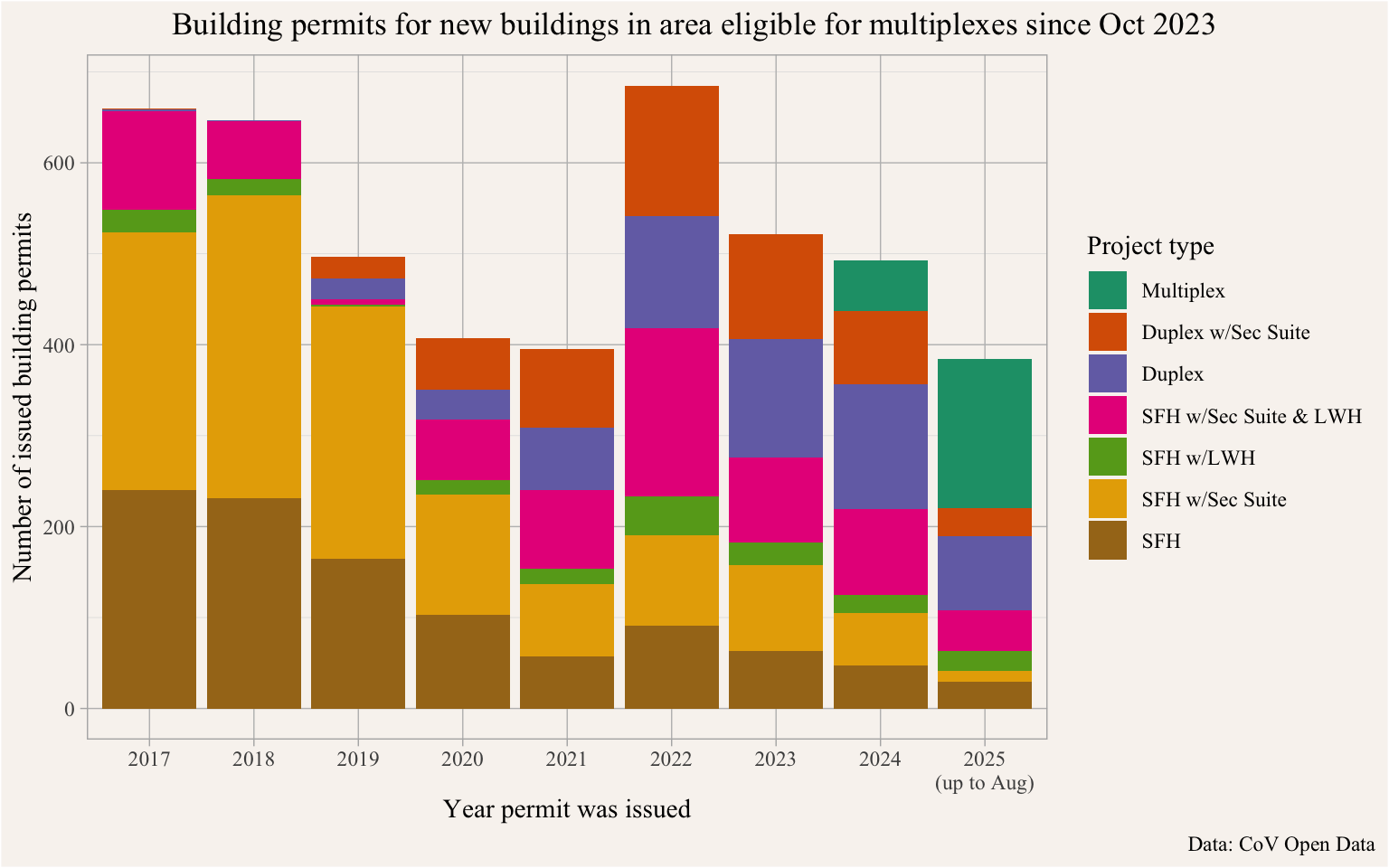 Figure 5 offers a view into the landscape of low-density development in the R1-1, RT-7, RT-9, and FSD zones that legalized multiplexes by tracking issued building permits for single family, duplex, and multiplexes by year the permit was issued.
