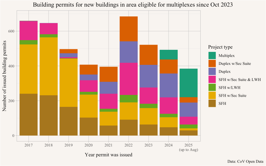 The province drew upon our research in formulating its Small Scale Multi Unit Housing (SSMUH) reforms, mandating all municipalities allow multiplex on previously single-family lots (as of November 2023). The City of Vancouver was working on its own multiplex reform, and snuck under the wire by passing a bylaw that reclassified single-family lots to multiplex in October of 2023, just before the lots at issue would have come under provincial regulation.1 We take this as an occasion to take stock of how Vancouver multiplexes have fared so far. We don’t have enough data to do a thorough analysis like we did for Kelowna and Coquitlam, but there is enough to take a preliminary look.