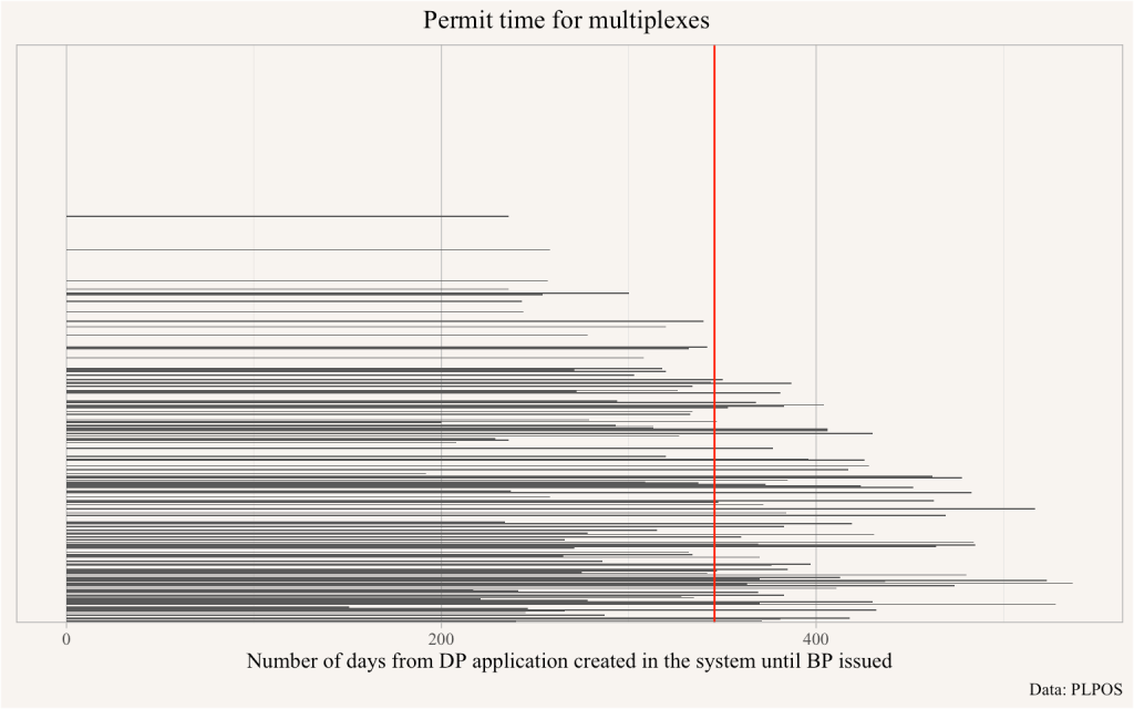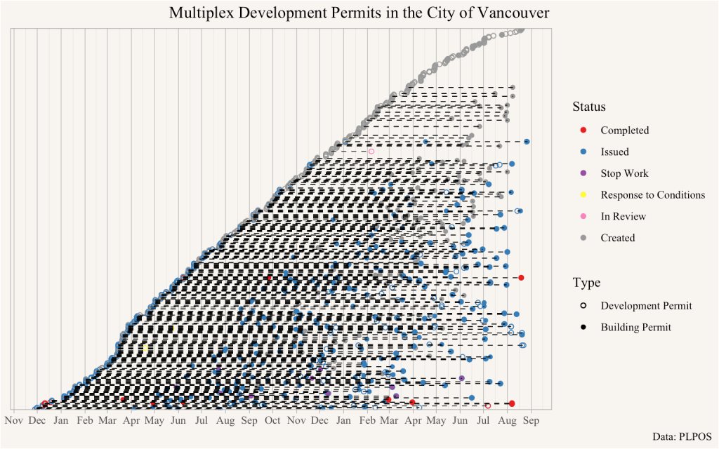 A naive interpretation might suggest that permit times are decreasing, but it would be foolish to conclude that from this graph. The blank spaces of projects that have not yet received a building permit highlight the right-censored nature of the data and signal projects with outstanding permits that, once they get issues, will necessarily have longer permit times than nearby (in terms of creation date) permit applications that have already been issued building permits. Vancouver council’s 3-3-3-1 Permit Approval Framework, which suggests that multiplex permits should be given in 3 weeks, is clearly not working yet, and there is no strong indication of improvement in multiplex permitting timelines.