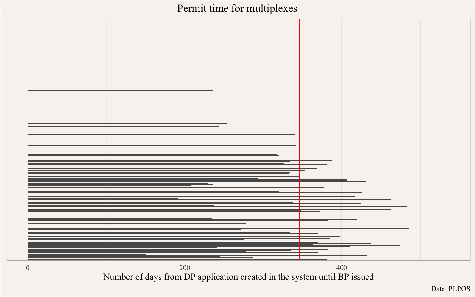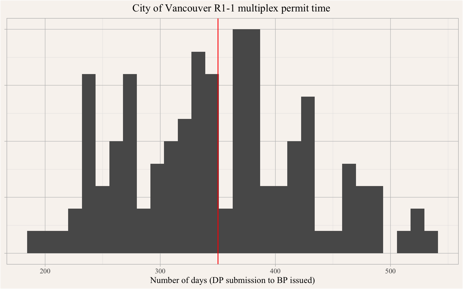 Figure 3 shows the distribution of permitting timelines, from creating of the development permit to issuance of building permit, conditioning on having an issued building permit. The right-censored nature of the data makes it difficult to give definitive statements about permit times, a strong lower bound on permit times derived from is 350 days, with a wide distribution ranging from very fast permit times of 200 days at the low end and over 500 days at the high end so far.