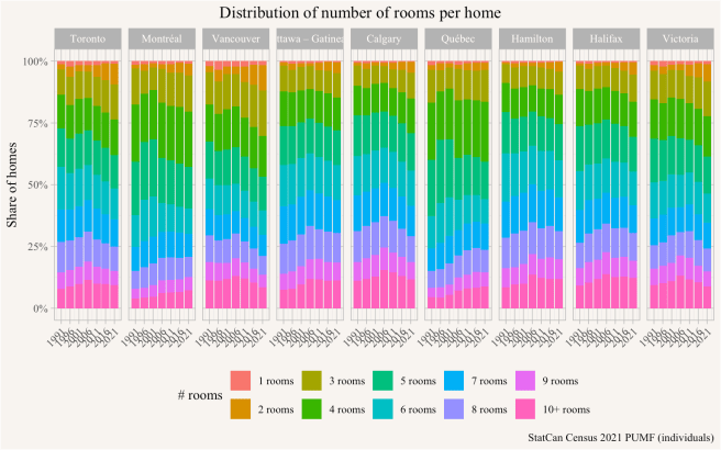 To make shelter cost more comparable across homes we normalize it by the number of rooms in the home as a proxy for the size of the home. One could also normalize by the number of bedrooms, but that data is only available for the 2011 through 2021 censuses and we are interested in longer timelines for this post.