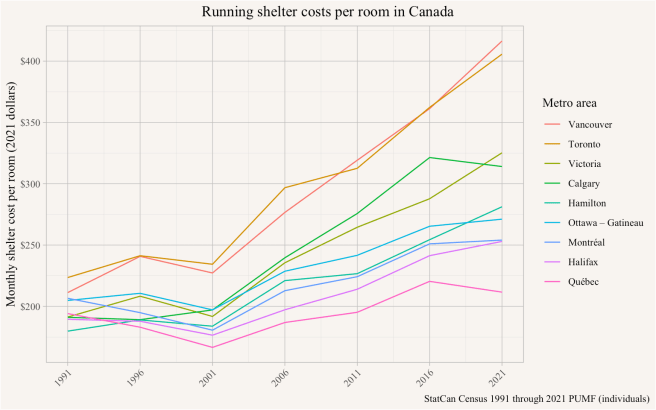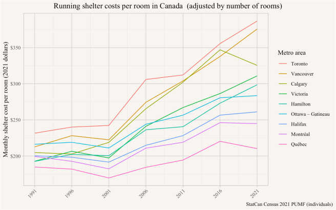 Figure 1 shows the shelter cost per room across time for several large Canadian metro areas.