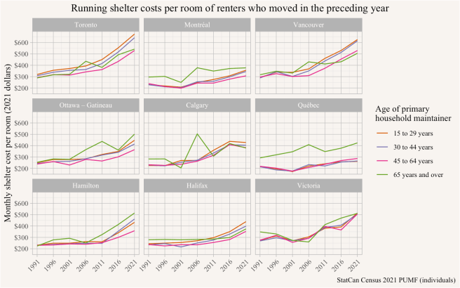 This is a good time to pause and think about how one might interpret this information. Increases in cost over time track fairly well with our understanding of housing shortages, with Québec City demonstrating very little shortage and Vancouver and Toronto demonstrating a lot. (Lauster Nathanael and von Bergmann 2024) The differences by age are more difficult to interpret, they could be due to older people having been able to lock in housing costs in the past, having bought a home quite some time ago or benefiting from rent control after renting for a long time. But it could also be that older people tend to live in roomier places in the suburbs, benefiting from economies of scale, while younger people choose to live in more central locations, near more amenities, or in higher quality homes, which tend to have higher rents and prices. To disentangle this we can condition on renters, which removes the effects of e.g. people having low shelter costs because they have paid down their mortgage. We can also condition on recent movers to remove most of the effect of rent control. Figure 7 shows how this group fares over time.