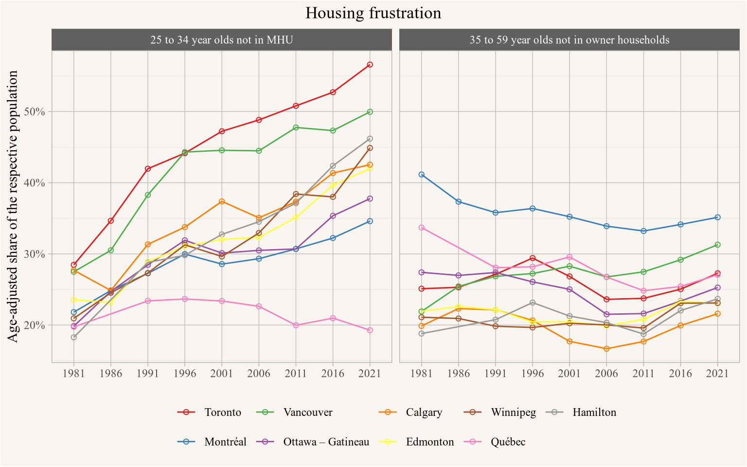 But there are some other factors that might play into this too. Household formation and tenure choice are both downstream of housing pressures, so conditioning on them can lead to collider bias, as we have previously explained. (von Bergmann and Lauster 2023; N. Lauster and Bergmann 2025; Lauster Nathanael and von Bergmann 2024). We have proposed two measures of housing frustration based on household formation and tenure choice that can help quantify these pressures (von Bergmann and Lauster 2024), as shown in Figure 8 that we include here again for convenience. The housing frustration metric shows very high levels of suppressed household formation especially in Vancouver and Toronto that could explain some of the age patterns we see here via selection of richer folks into independent households among younger age groups. The question about tenure choice is more complicated and the relationship to the different spreads between age groups is less clear.