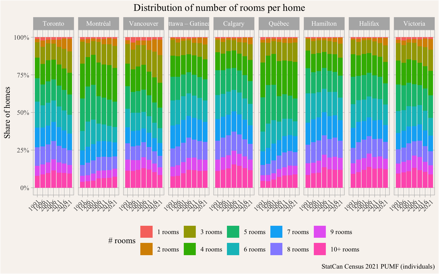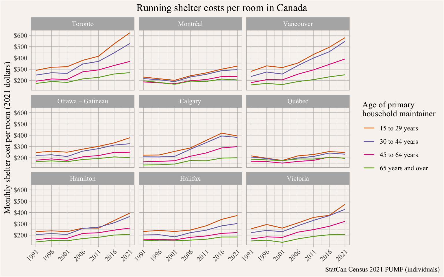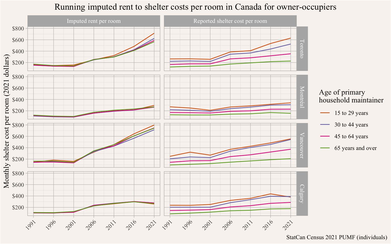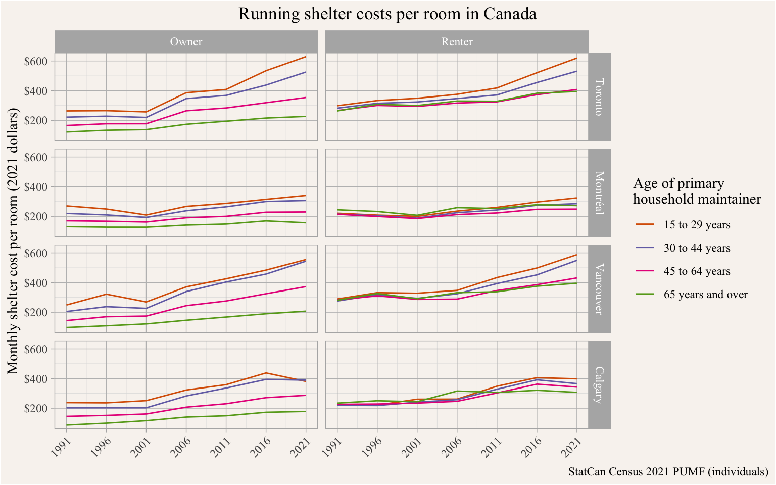 In Canada we don’t know of a good data source on square footage and shelter costs by age breakdown, but we can achieve something similar by looking at shelter cost per room. Of note for current Census definitions, number of rooms includes “kitchens, bedrooms and finished rooms in the attic or basement” but excludes “bathrooms, halls, vestibules and rooms used solely for business purposes,” with specific judgments otherwise left to the respondent. As a specific example, consider a studio apartment where the kitchen was partially behind a wall. The number of rooms might be listed as one or two, depending upon the respondent. This kind of ambiguity is built into the rooms measure. But we have looked at number of rooms as a metric for household tightness before (von Bergmann and Lauster 2023), and while it is far from perfect (with sizes of rooms, as well as how we divide homes into rooms, changing over time and likely differing across regions in addition to inherent ambiguity), we believe it still offers a somewhat decent proxy for the size of homes.