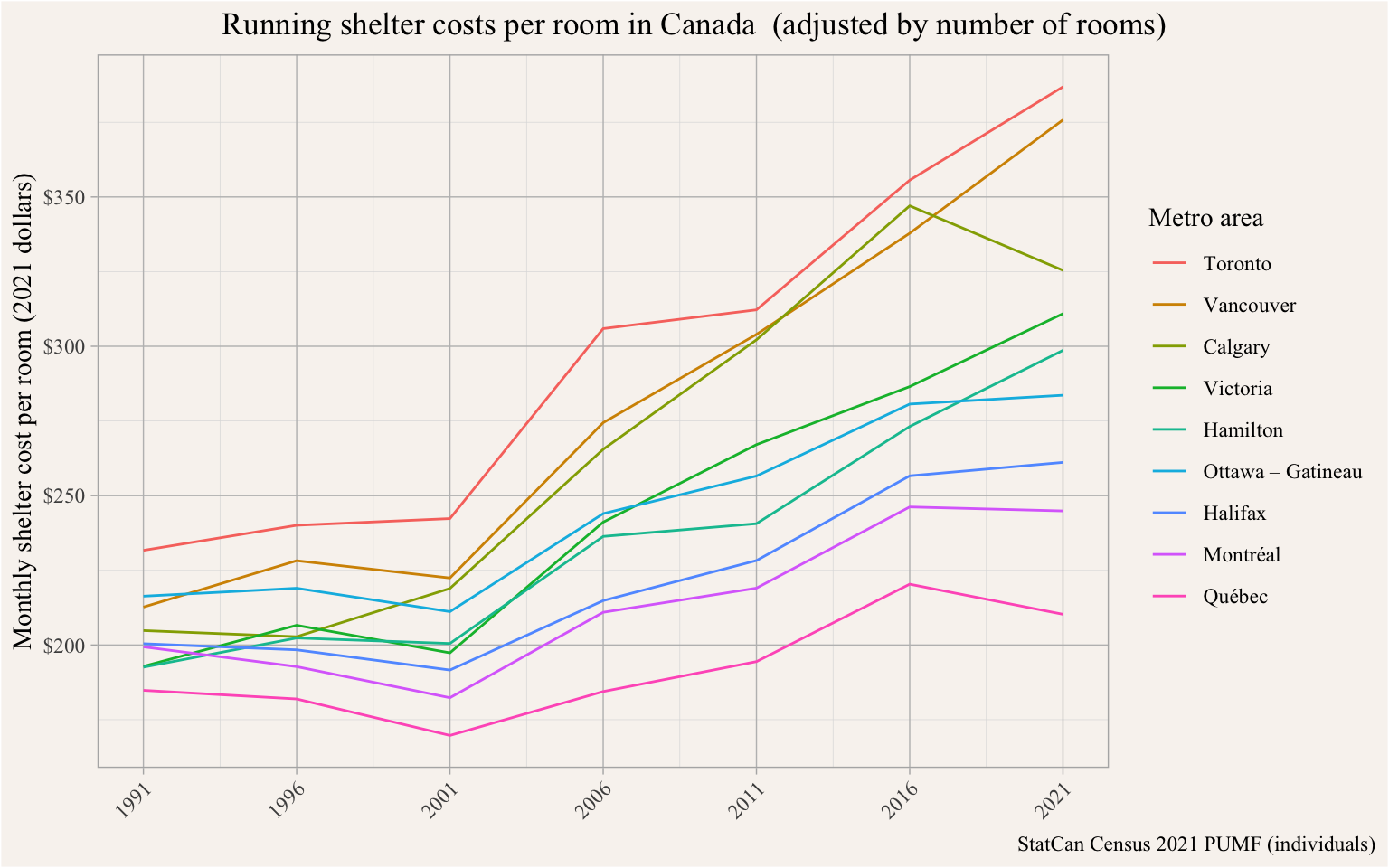 Figure 1 shows the shelter cost per room across time for several large Canadian metro areas.