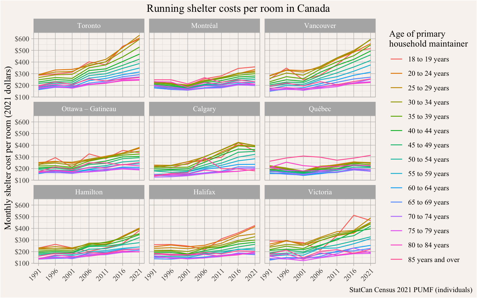 This shows a fairly consistent pattern with younger people having higher shelter costs per room, and shelter costs per room declining as we move upward through the age groups. There is variance in the size of the spread, as well as how it increased over time. And the sample gets thin for some age groups in some regions, in particular the 18 to 19 year old bracket, leading to some noise. The Québec City metro area again stands out with it’s low spread and fairly flat development over time. Toronto and Vancouver again show the largest spread and largest increase.