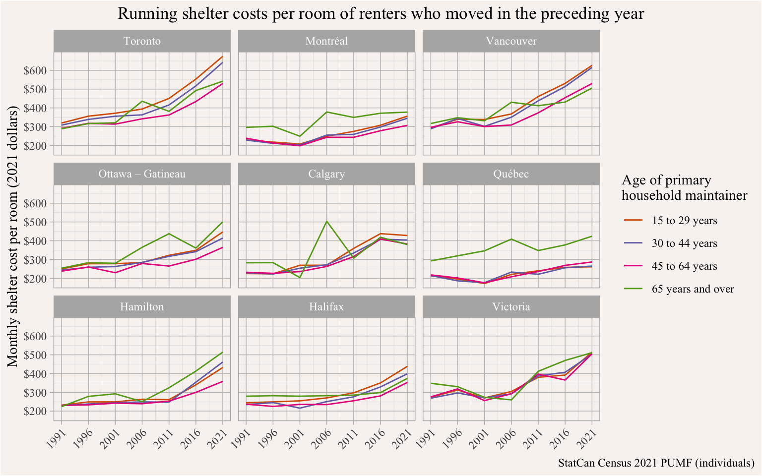 This is a good time to pause and think about how one might interpret this information. Increases in cost over time track fairly well with our understanding of housing shortages, with Québec City demonstrating very little shortage and Vancouver and Toronto demonstrating a lot. (Lauster Nathanael and von Bergmann 2024) The differences by age are more difficult to interpret, they could be due to older people having been able to lock in housing costs in the past, having bought a home quite some time ago or benefiting from rent control after renting for a long time. But it could also be that older people tend to live in roomier places in the suburbs, benefiting from economies of scale, while younger people choose to live in more central locations, near more amenities, or in higher quality homes, which tend to have higher rents and prices. To disentangle this we can condition on renters, which removes the effects of e.g. people having low shelter costs because they have paid down their mortgage. We can also condition on recent movers to remove most of the effect of rent control. Figure 7 shows how this group fares over time.