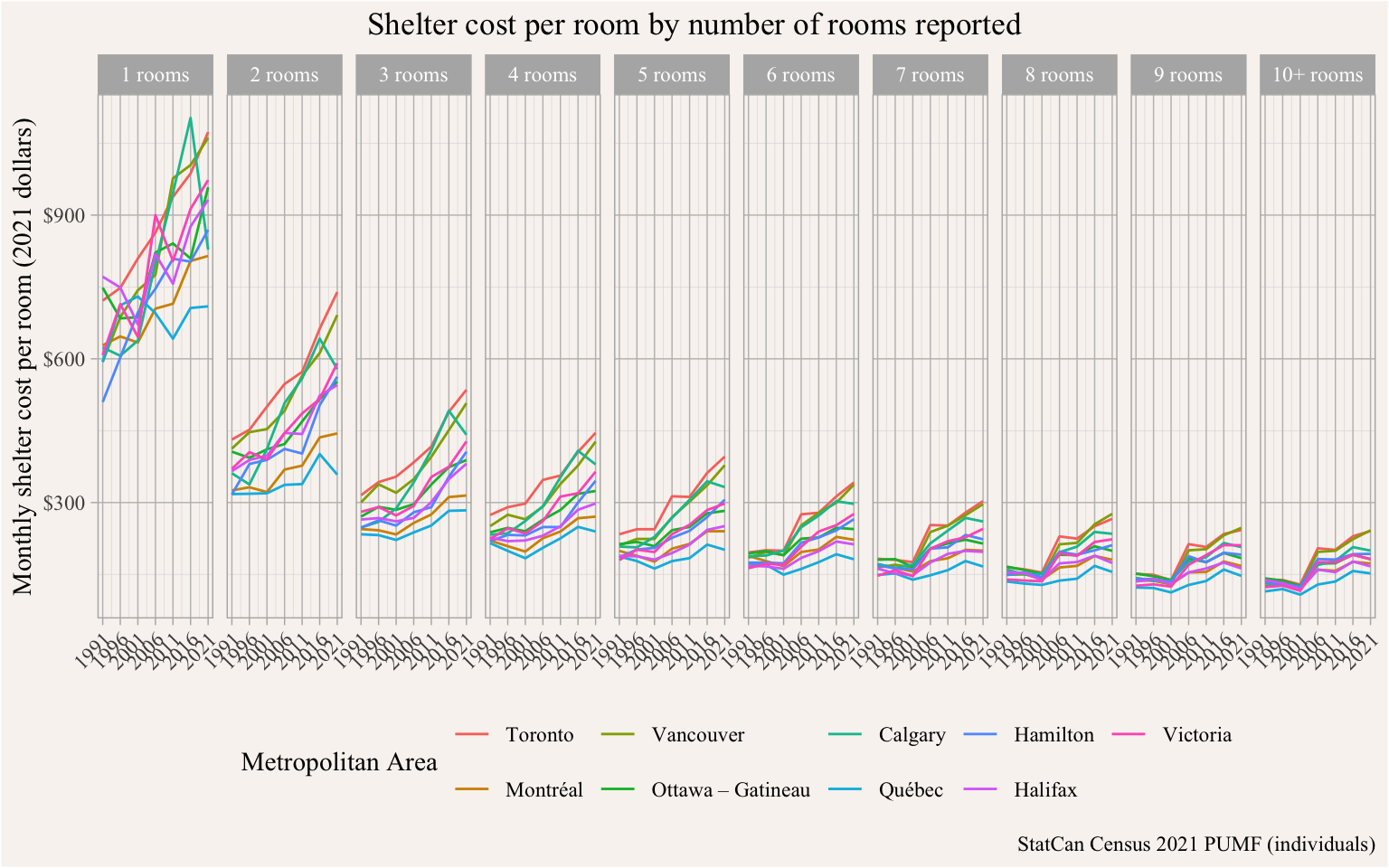 To make shelter cost more comparable across homes we normalize it by the number of rooms in the home as a proxy for the size of the home. One could also normalize by the number of bedrooms, but that data is only available for the 2011 through 2021 censuses and we are interested in longer timelines for this post.